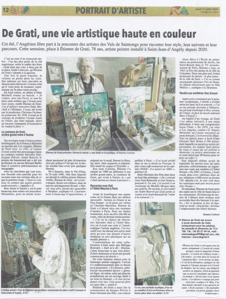 Pour l’année qui commence, l’artiste angérien possède quelques projets. Son atelier, situé au 59 de la rue des Maréchaux, est accessible à tous et permet de découvrir l’univers protéiforme d’Étienne de Grati. « J’espère aussi vendre un ou deux de mes tableaux aux enchères à l’hôtel Drouot de Paris. » Même s’il semble se trouver un peu à l’étroit à Saint-Jean-d’Angély, Étienne de Grati saura partager ses passions avec le public.